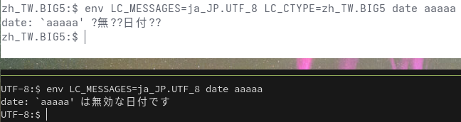 env LC_MESSAGES=ja_JP.UTF_8 LC_CTYPE=zh_TW.BIG5 date aaaaa