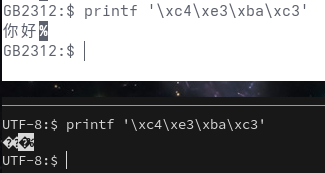 env LC_CTYPE=zh_CN.GB2312 printf '\u4f60\u597d' | env LC_CTYPE=zh_CN.UTF-8 iconv -f GB2312后两条命令中,环境很多时候会配置 LANG,LANGUAGE,LC_ALL 检查一下,如果 unset 掉,不加这两条 env 会用默认的 C.ASCII 来解析